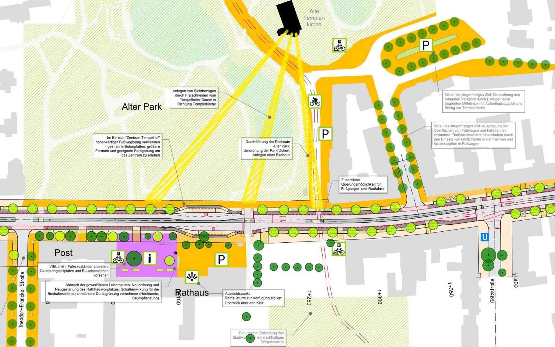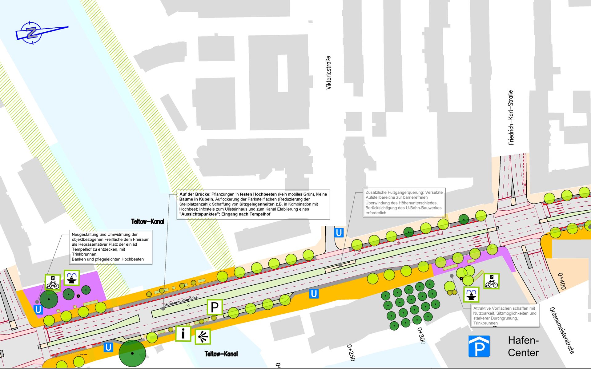 Für ein zwei Kilometer langes Teilstück im Zentrum der Straße wurde ein Gestaltungskonzept für die einheitliche Überarbeitung sämtlicher Fußwege, Plätze und des Mittelstreifens erarbeitet. Dabei konnte ein hohe Anzahl neuer Baumstandorte aufgezeigt werden, die die Zahl der zu fällenden Bäume deutlich übersteigt. Bisher gesichtslose Plätze werden neu gestaltet und beziehen sich durch die markanten Elemente aufeinander, werden vernetzt. Für einige Teilstücke des Mittelstreifens über der U-Bahn konnten optisch und technisch ansprechende Erhöhungen geplant werden, die nunmehr eine Bepflanzung zulassen. Eine deutlich höhere Anzahl von Radabstellanlagen findet sich in der Müllerstraße nach der Umgestaltung.
