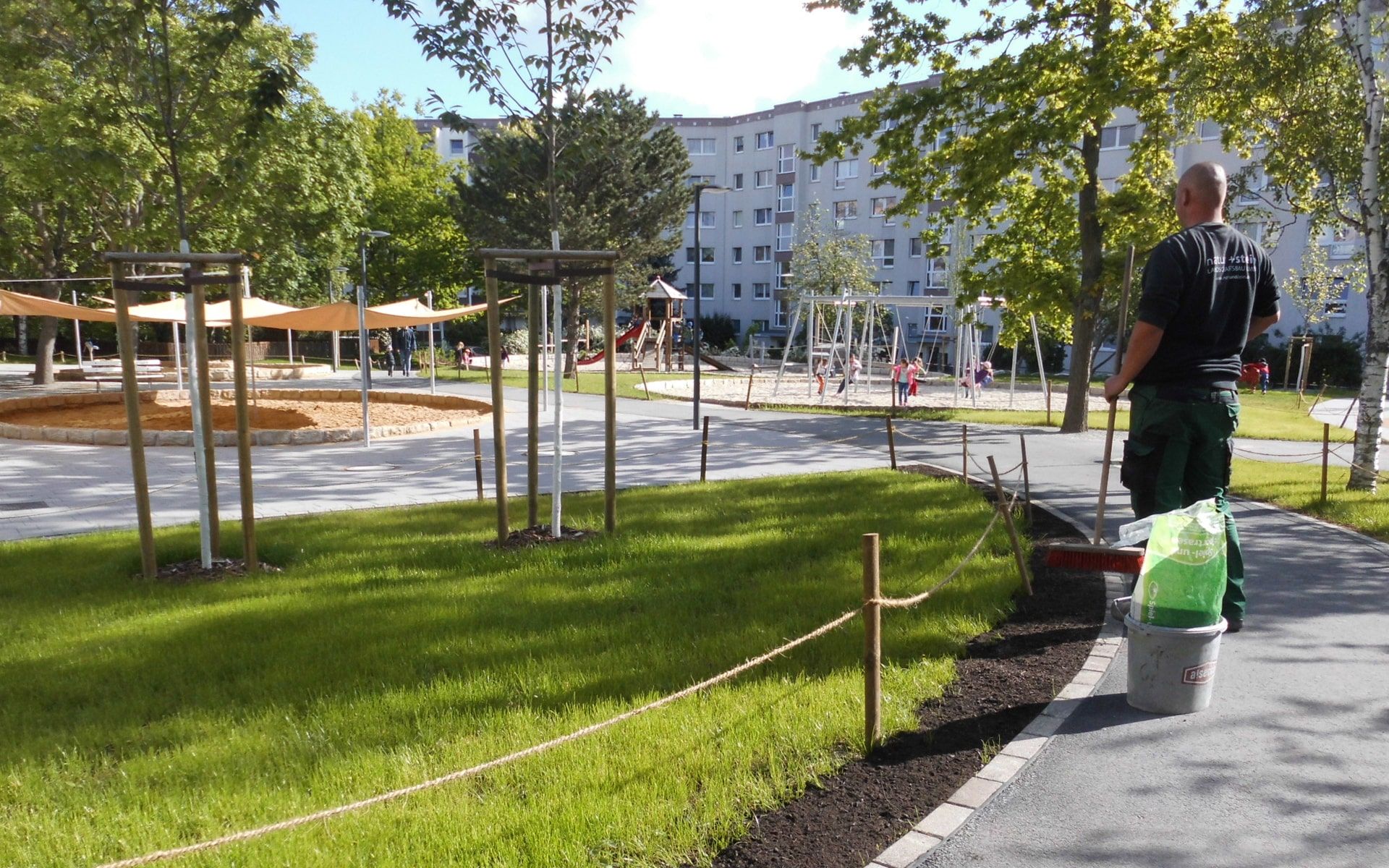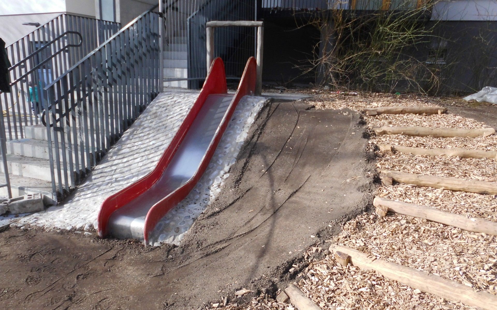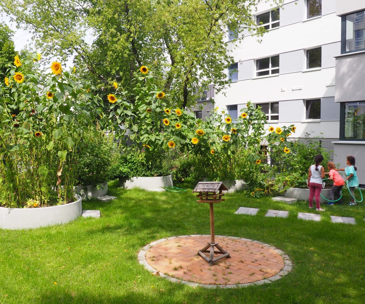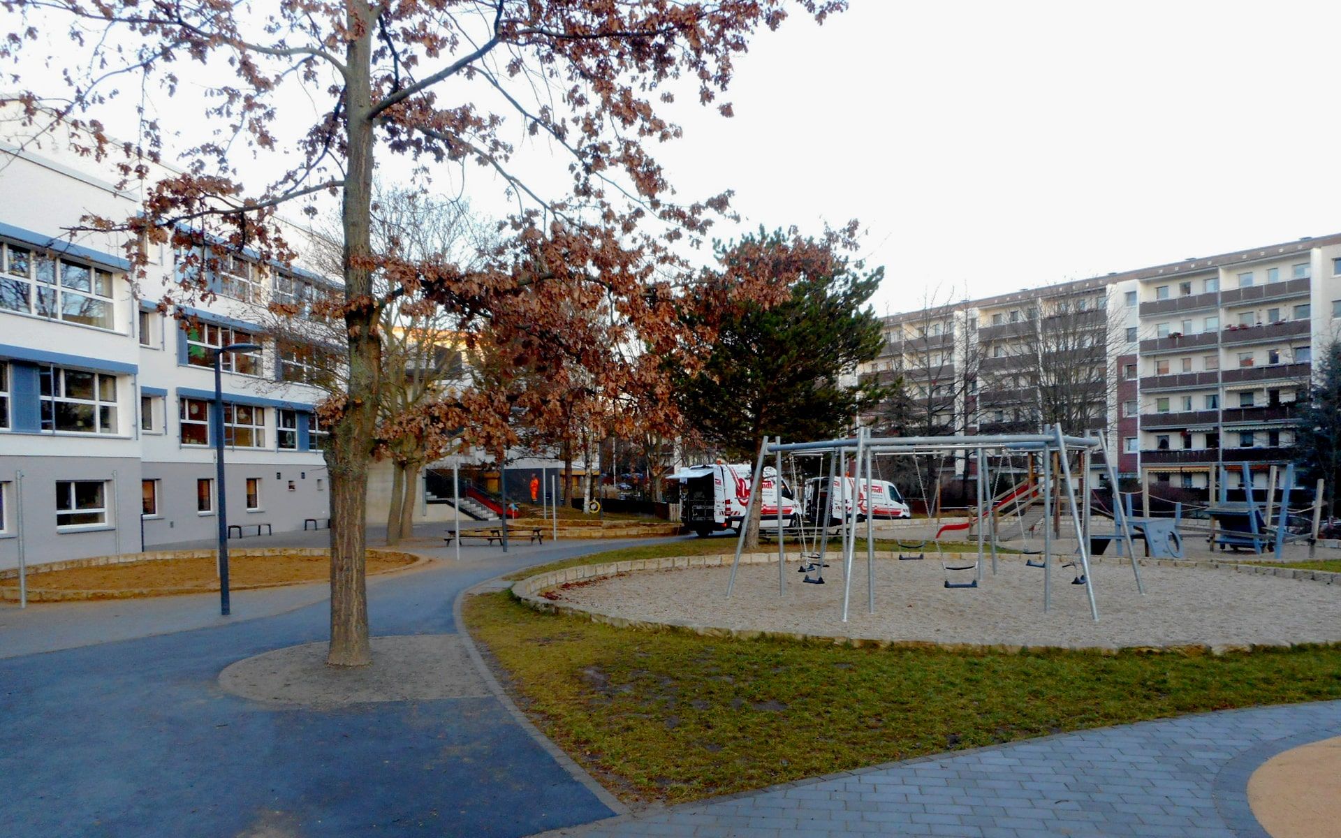 Die Kindertageseinrichtung im Helbigsdorfer Weg liegt im Stadtteil Dresden Gorbitz, inmitten der größten Plattenbausiedlung der Stadt aus den 1980er Jahren. Die parallel erfolgte Sanierung und Modernisierung des Gebäudes erforderten eine grundlegende Veränderung der Freianlage. Dabei sollte der Bestand teilweise integriert werden sowie im Umfeld des Gebäudes den Wünschen der Nutzer und den aktuellen Bedürfnissen einer Kita entsprechen.