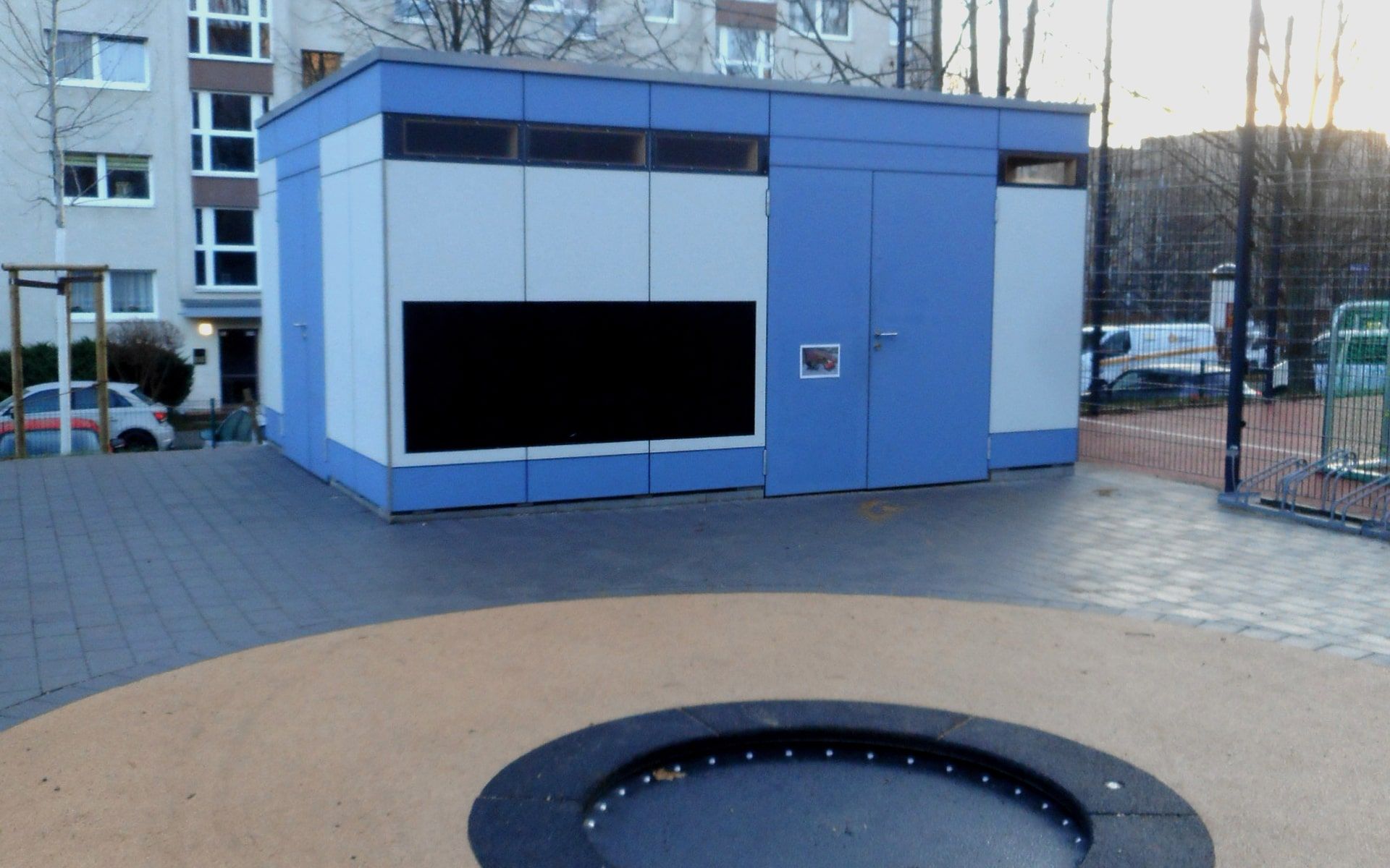 Die neuen kreisrunde Spielbereiche - Sandmatsch, Trampolin, Hochbeete, Kletterspiel - werden nunmehr erstmalig durch eine Rollerbahn zusammengefügt. Der Kita war eine Gruppenschaukel besonders wichtig, die ebenfalls im Kreis angeordnet ist. Einzig der erstmals auf dem Gelände befindliche Bolzplatz folgt zusammen mit den zwei Gartenhäusern der klassischen rechteckigen Form. Klar getrennt sind Wirtschafts- und Kindergartenflächen.