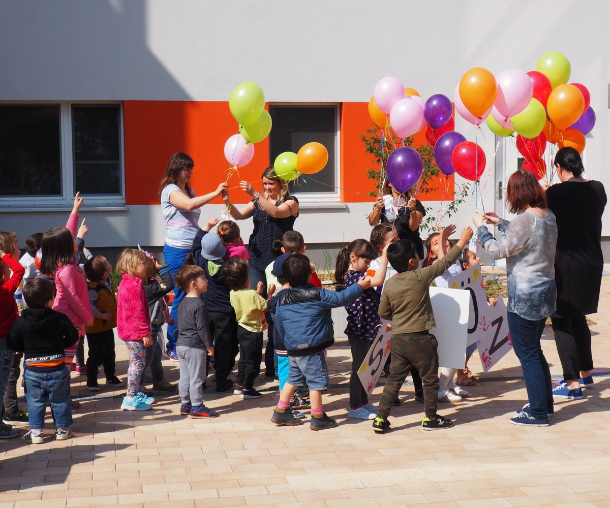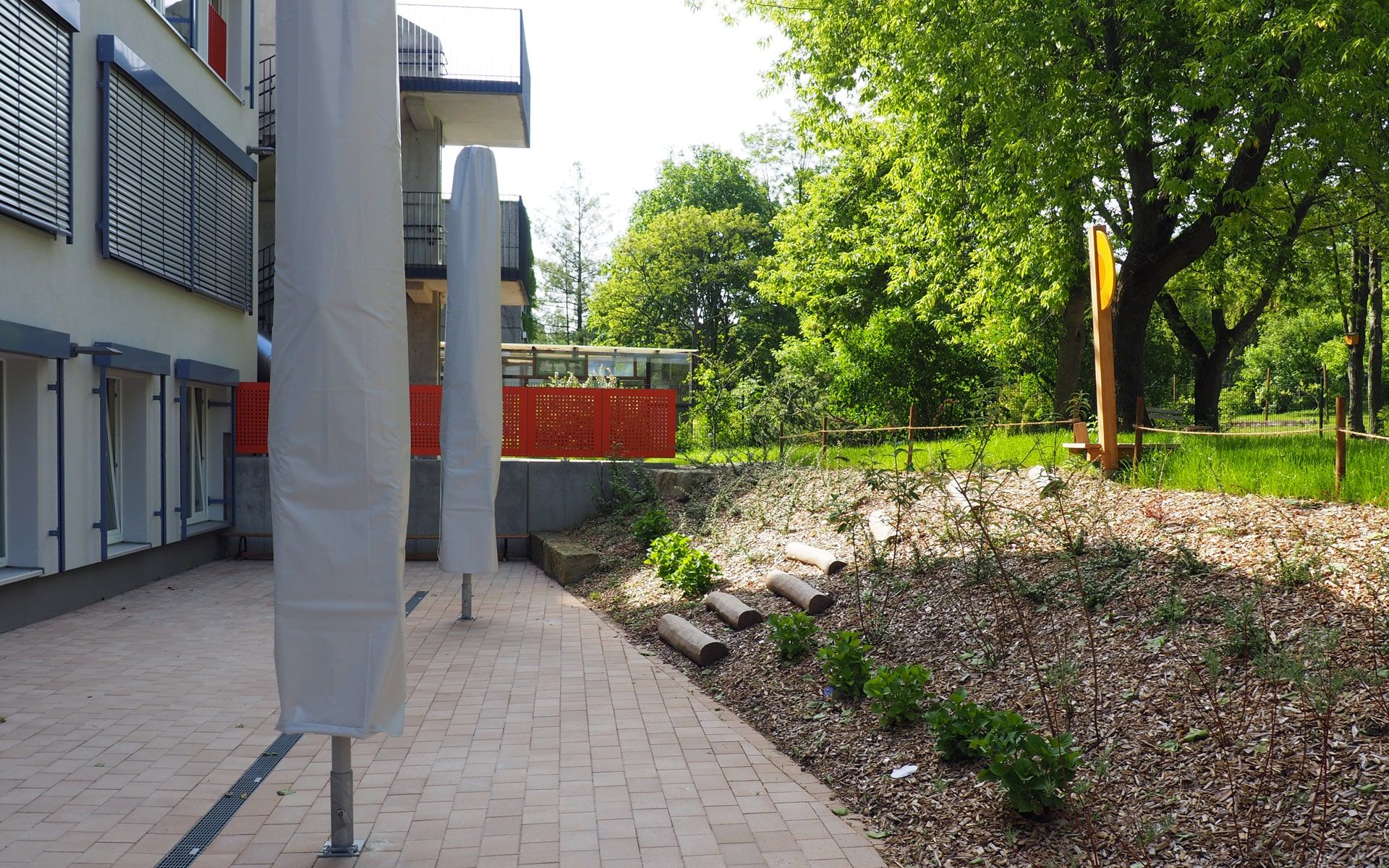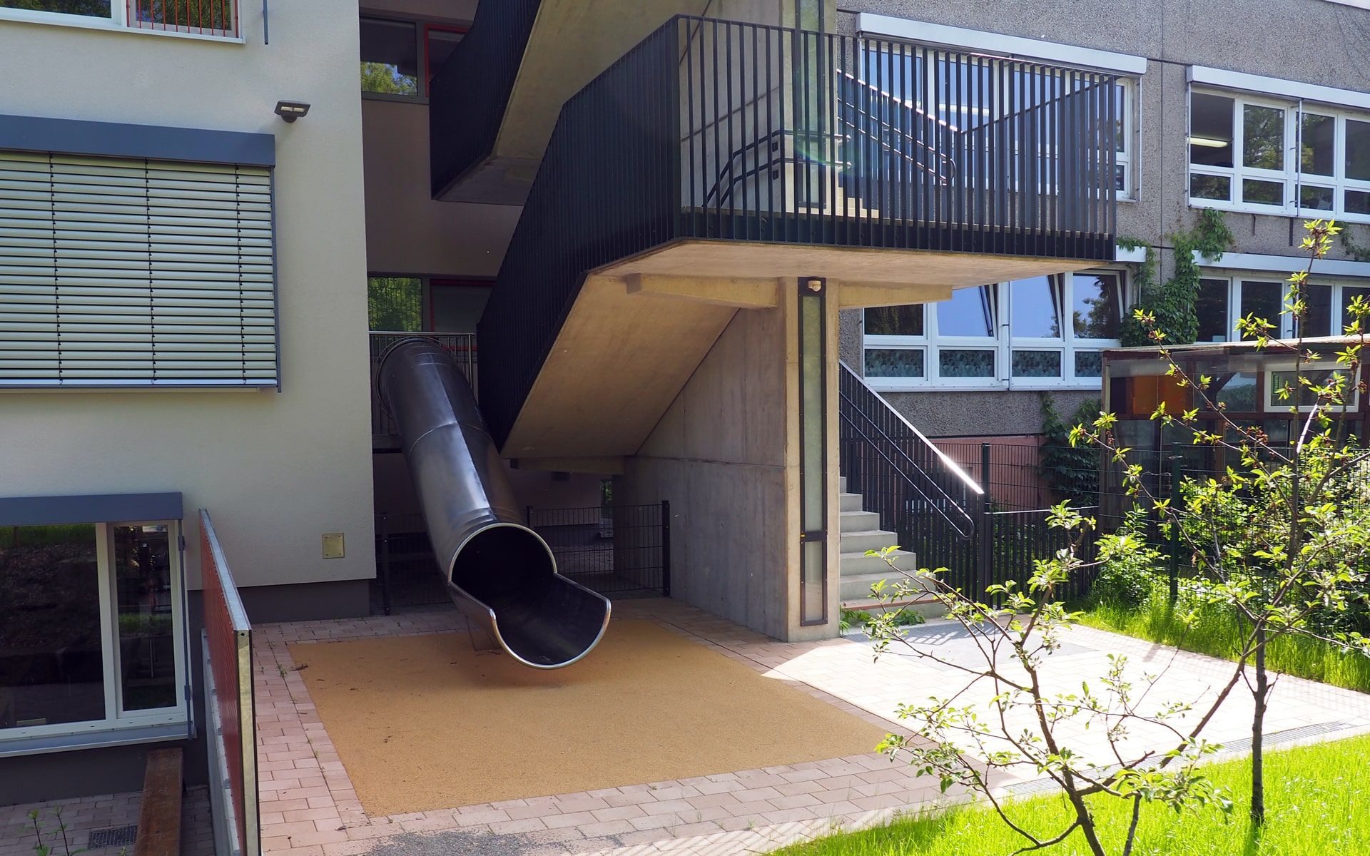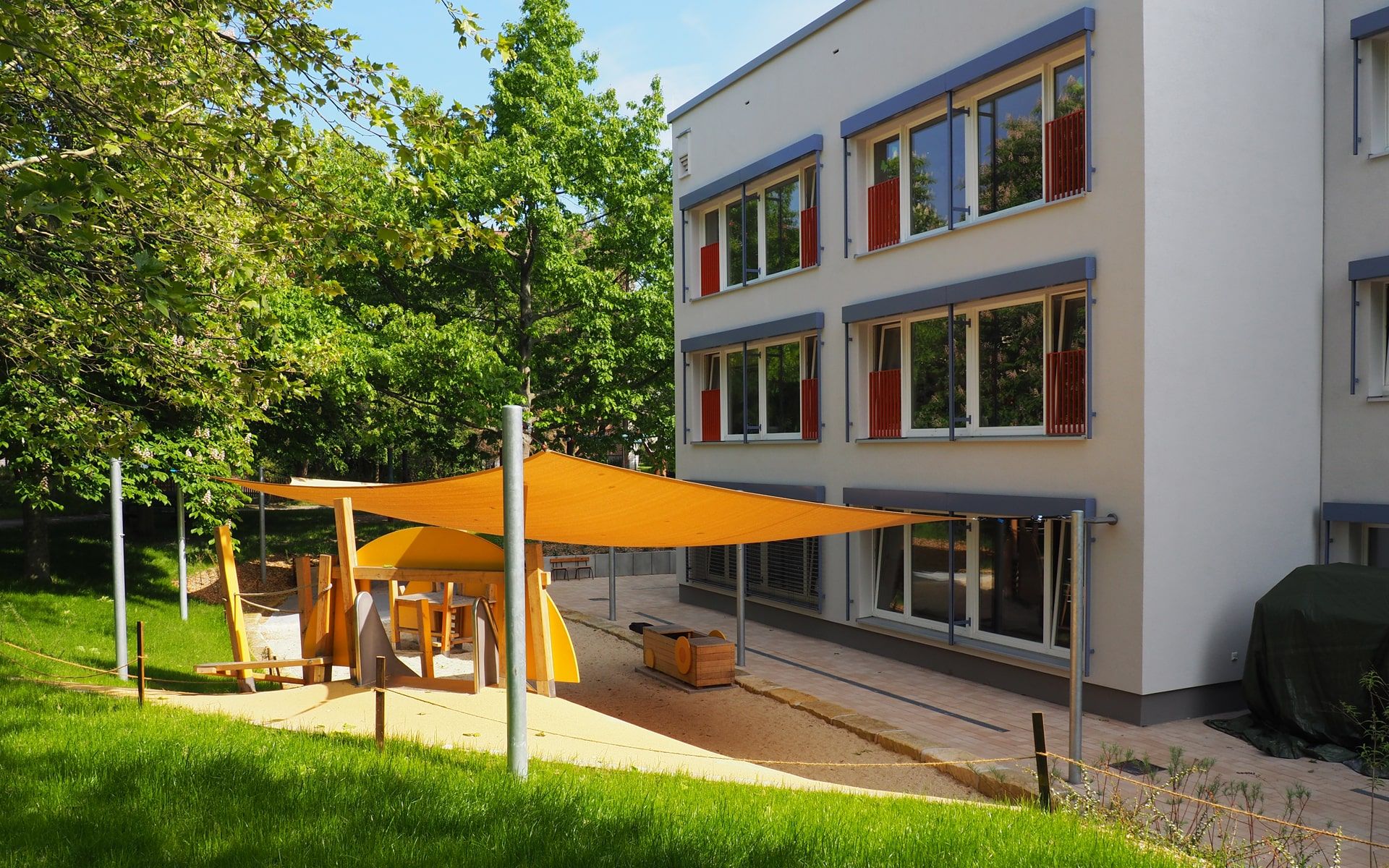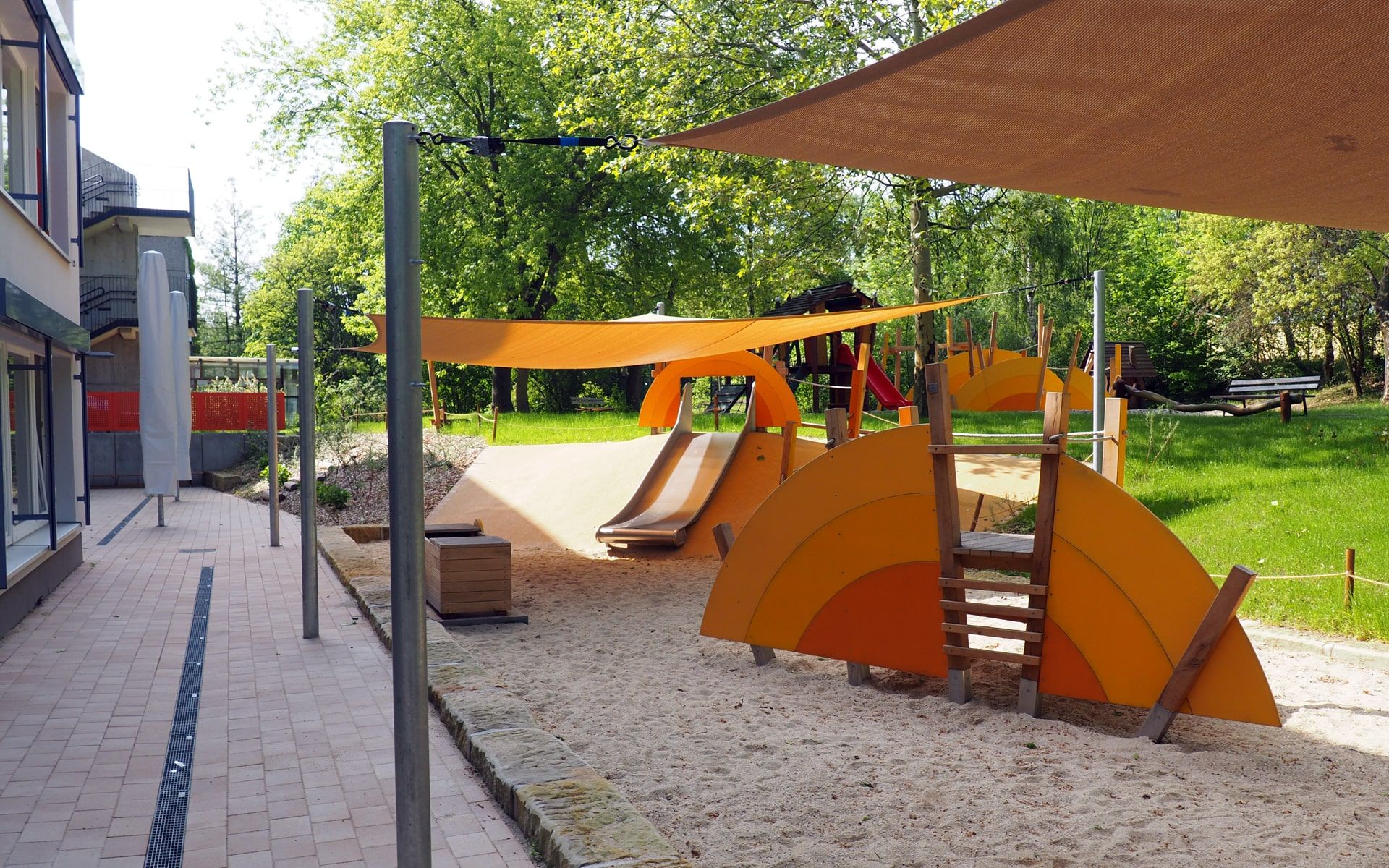 Das Freigelände der Kita war vor der Umgestaltung stark geprägt von durch Zäune abgegrenzte Flächen mit Wegen aus grauen Wiedemannplatten innerhalb von ungestalteten und überstrapazierten Bereichen. Ein massives oberirdisches Fernwärmebauwerk nahm wertvollen Spielbereich in Anspruch. Durch Umverlegung konnte das Höhenniveau neu geordnet, der Zugang barrierefrei gestaltet werden. Die Freifläche wirkt nunmehr luftig und großzügig. Der Name der Kita wurde zum Programm, Spielelemente mit Spielsonnen in fröhlichen Farben laden zum Klettern, Rutschen, Verstecken und Entdecken für alle Altersgruppen ein. Integriert wurden ein Bolzplatz sowie ein neuer Wirtschaftsbereich, Gerätehaus und Stellplätze.