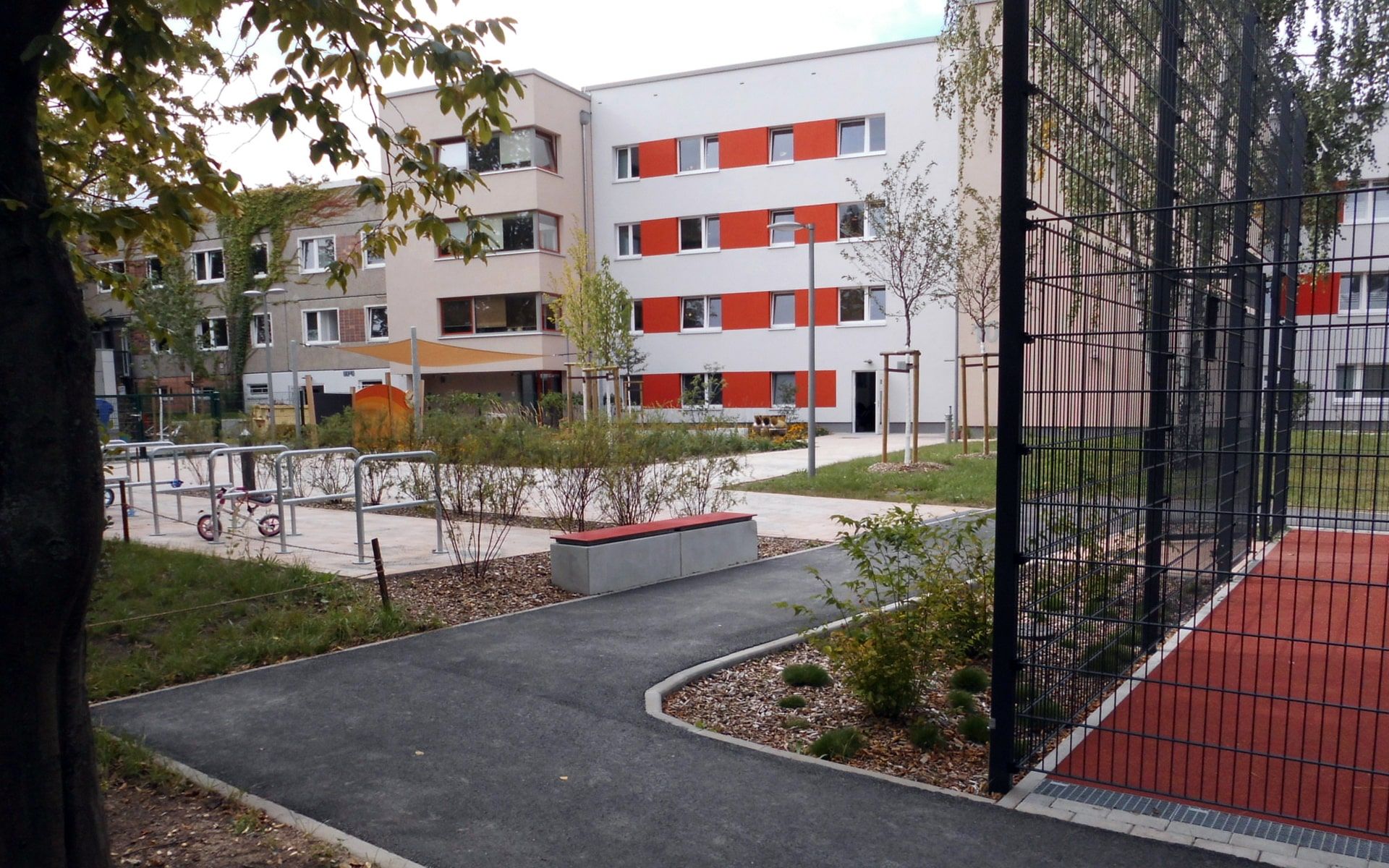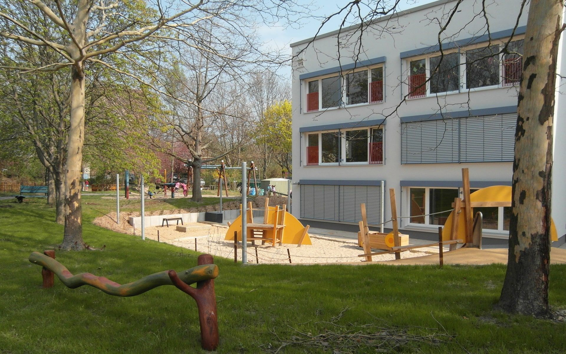 Die Kindertageseinrichtung „Sonnenland“ liegt im Stadtteil Dresden Gorbitz, inmitten der größten Plattenbausiedlung der Stadt aus den 1980er Jahren. Die Sanierung und Modernisierung des Gebäudes erforderten eine grundlegende Veränderung der Freianlage. Dabei sollte der Bestand teilweise integriert werden sowie im Umfeld des Gebäudes den Wünschen der Nutzer und den aktuellen Bedürfnissen einer Kita entsprechen. Das neue Konzept sieht eine Nutzung sowohl für Kinderkrippe, Kindergarten und Hort vor, es gibt eine Integrations- und eine heilpädagogische Gruppe.