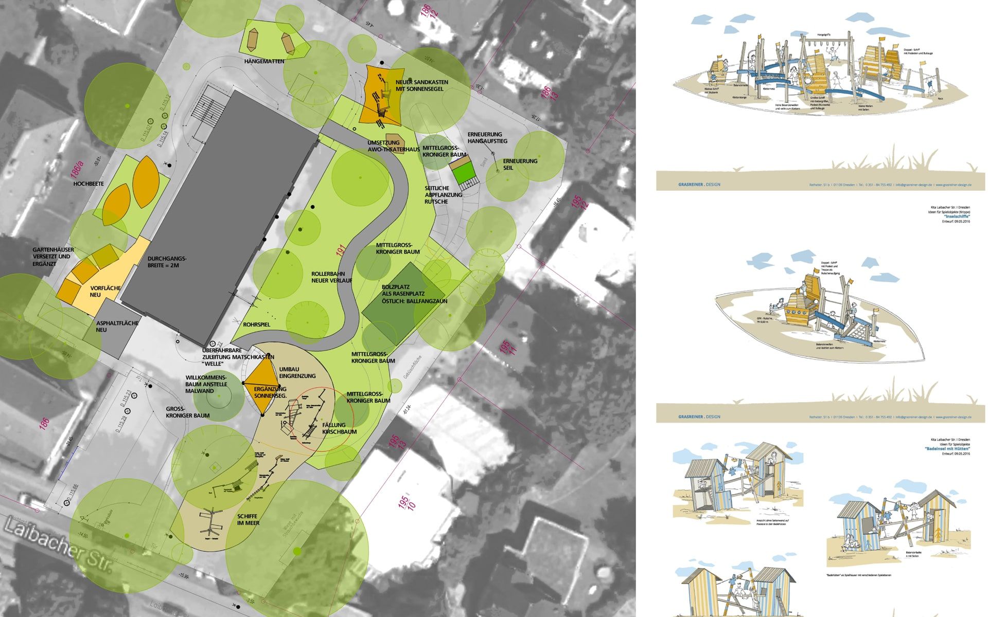 Die Kindertageseinrichtung „Löwenzahn“ in der Laibacher Straße im Dresdner Stadtteil Laubegast wurde 2005 neu gebaut. Die in diesem Zuge gestalteten Freianlagen entsprachen nicht den Nutzeranforderungen, so dass wir im Jahr 2016 mit einer Umplanung von Teilbereichen unter Einbeziehung des erhaltenswerten Bestandes beauftragt wurden.