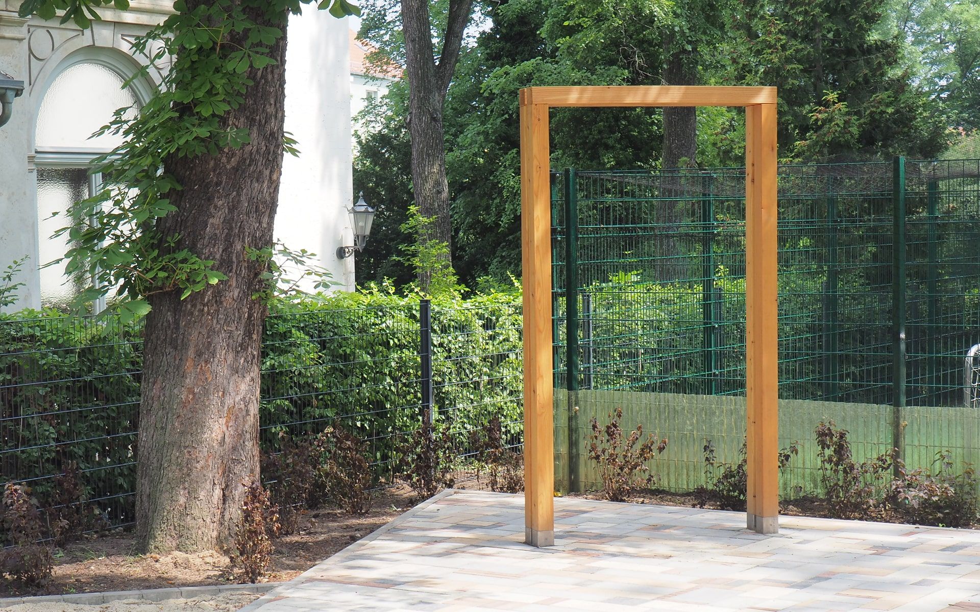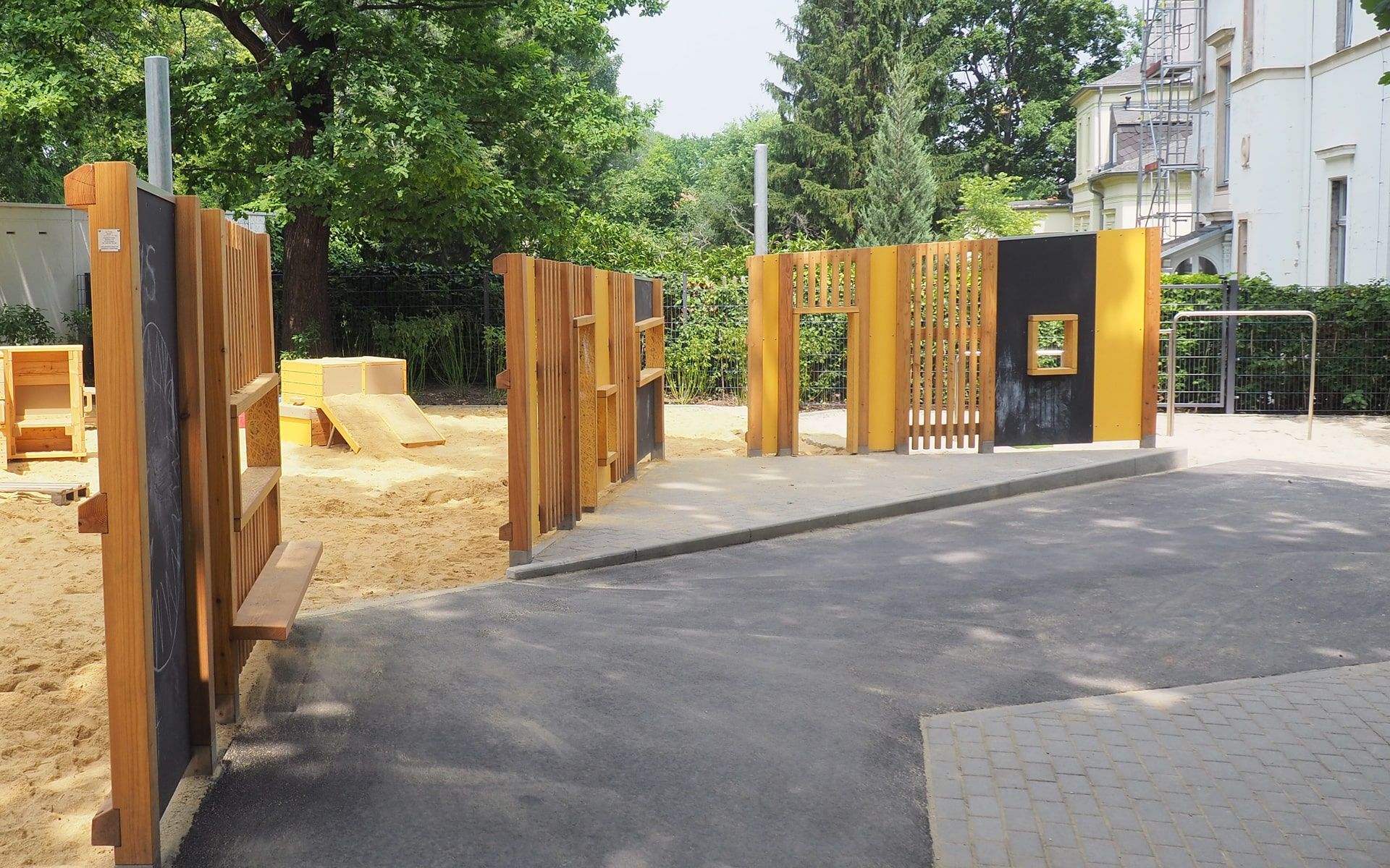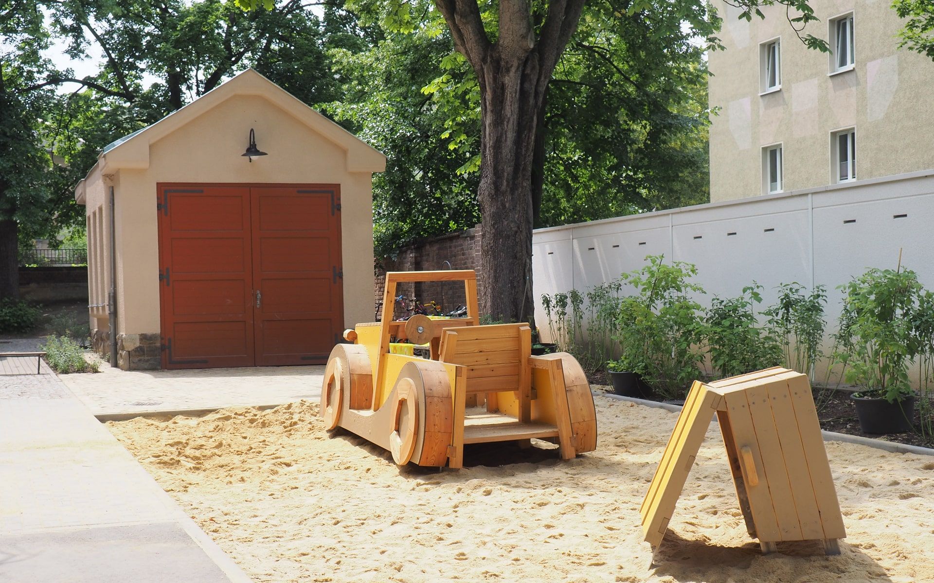 Alles ist heute noch zu sehen: Freds Auto, die Koffer, die Garage... und kann spielerisch verwendet werden. Ergänzt wurde eine Matschstrecke und Malwände sowie ein Theaterbogen nach den Wünschen der Nutzer. Wertvoller Baumbestand wurde in die Planung integriert und neue Pflanzungen behutsam ergänzt. Die Einzäunung des Grundstückes wurde unter Einbeziehung denkmalpflegerischer Vorgaben erneuert.