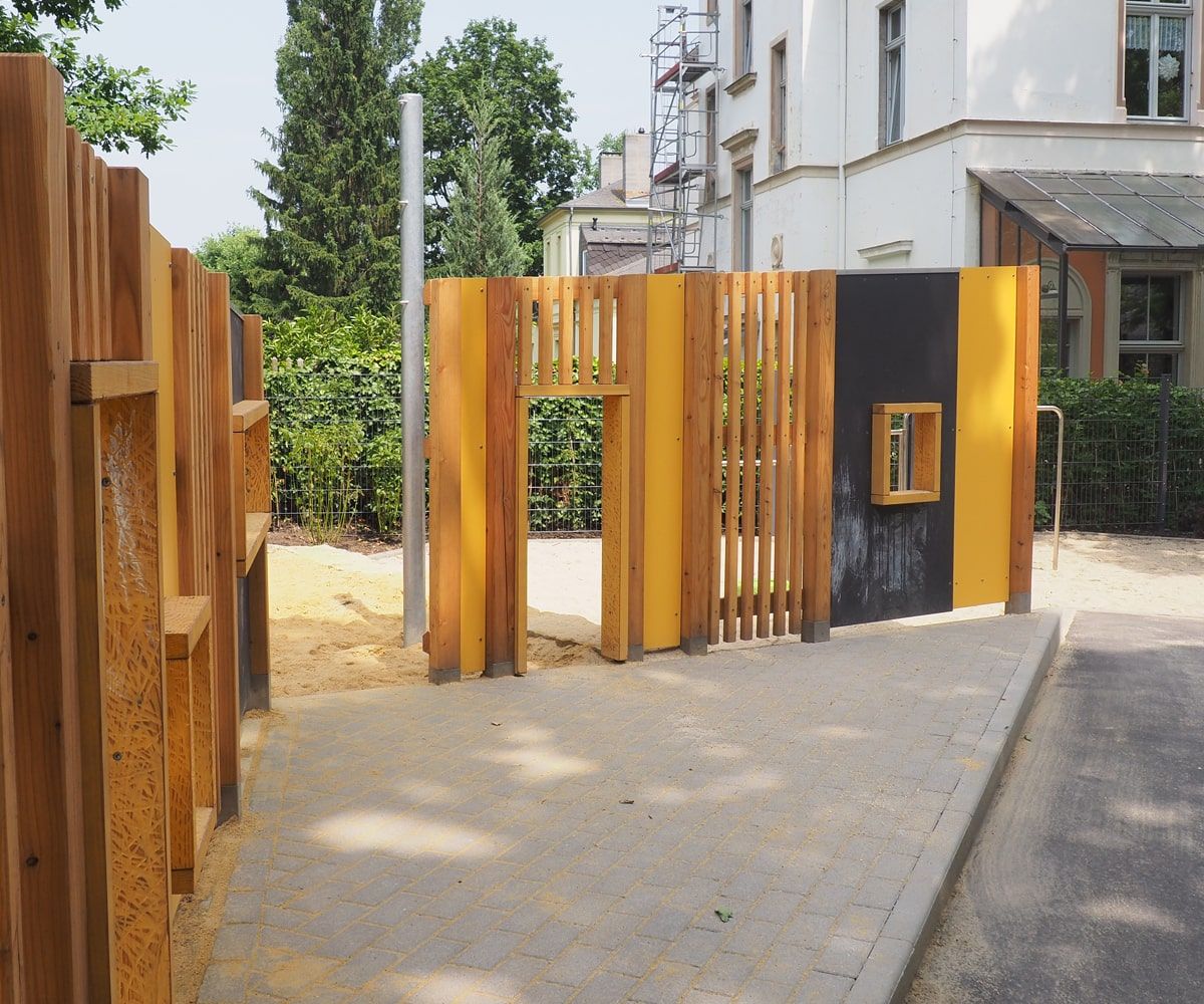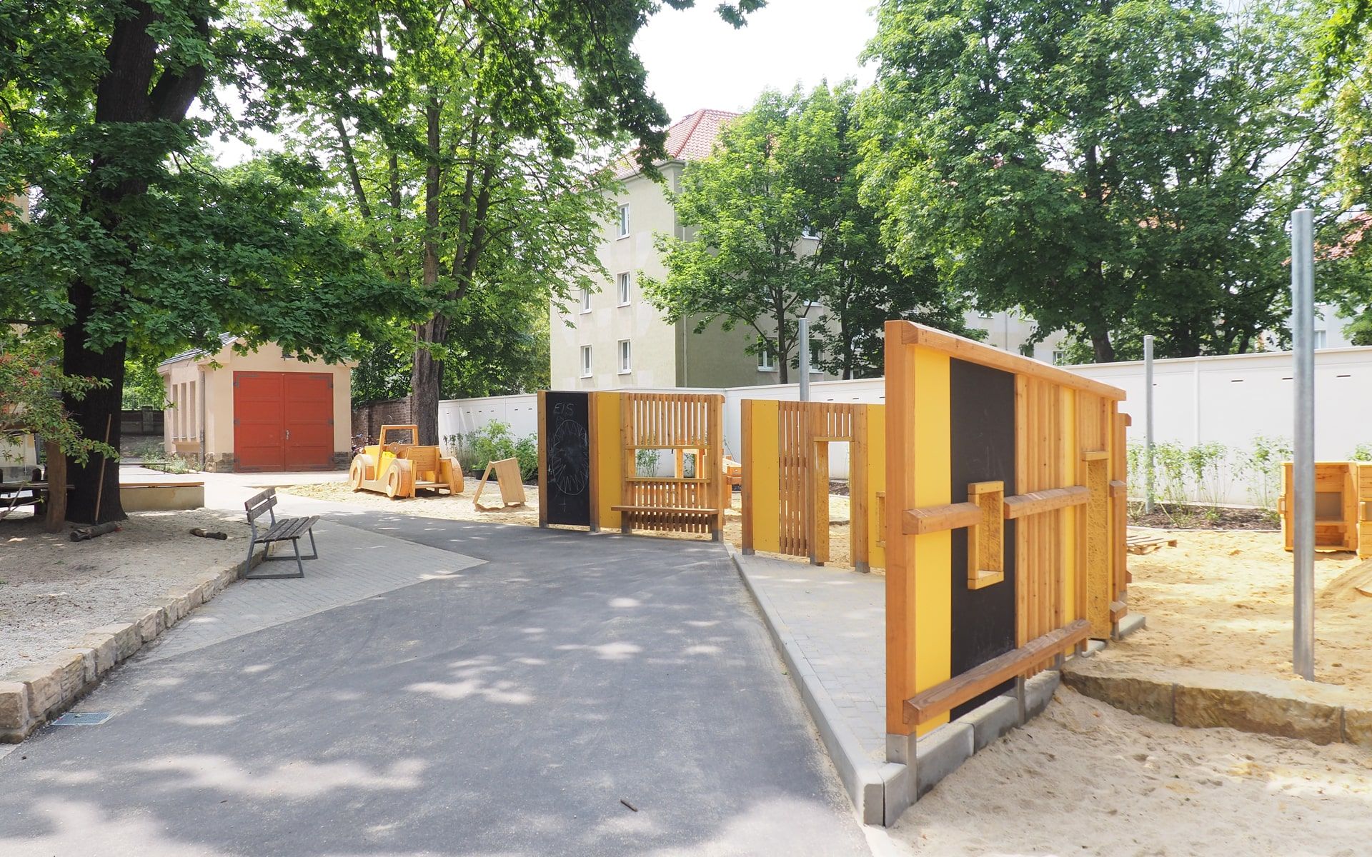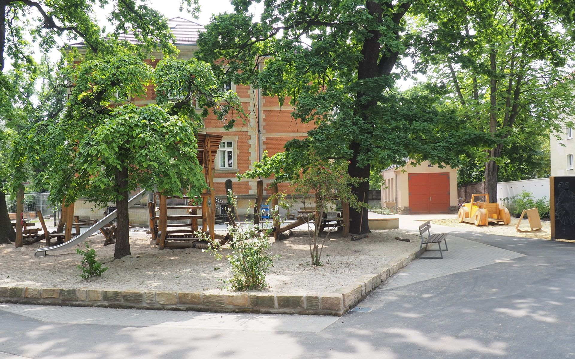 Die Kindertagesstätte „Spatzenvilla“ in der Dresdner Südvorstadt befindet sich in einer ehemaligen Fabrikantenvilla aus dem Jahr 1886. Das Gebäude wurde im Jahr 2014 denkmalgerecht saniert und nunmehr die Freianlage aufgewertet. Zu Beginn der Planung stellte das Freigelände eine Ansammlung unterschiedlichster Gartenhäuser, Spielgeräte, Materialien und Angebote dar. Unter Beibehaltung des zentralen Kletterspiels entwickelten wir rund um die historische Villa und eine denkmalgeschützte Garage der 1920er Jahre eine kleine Geschichte: