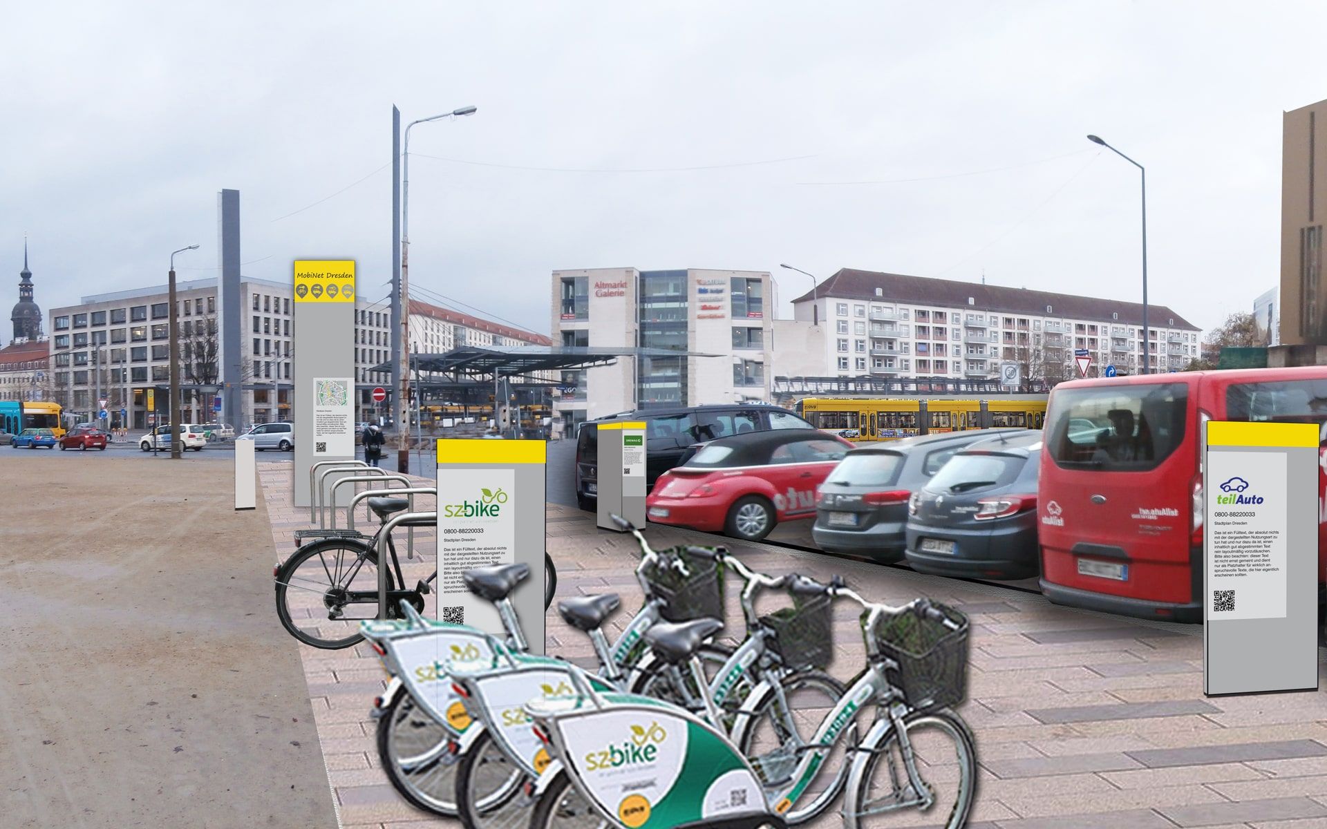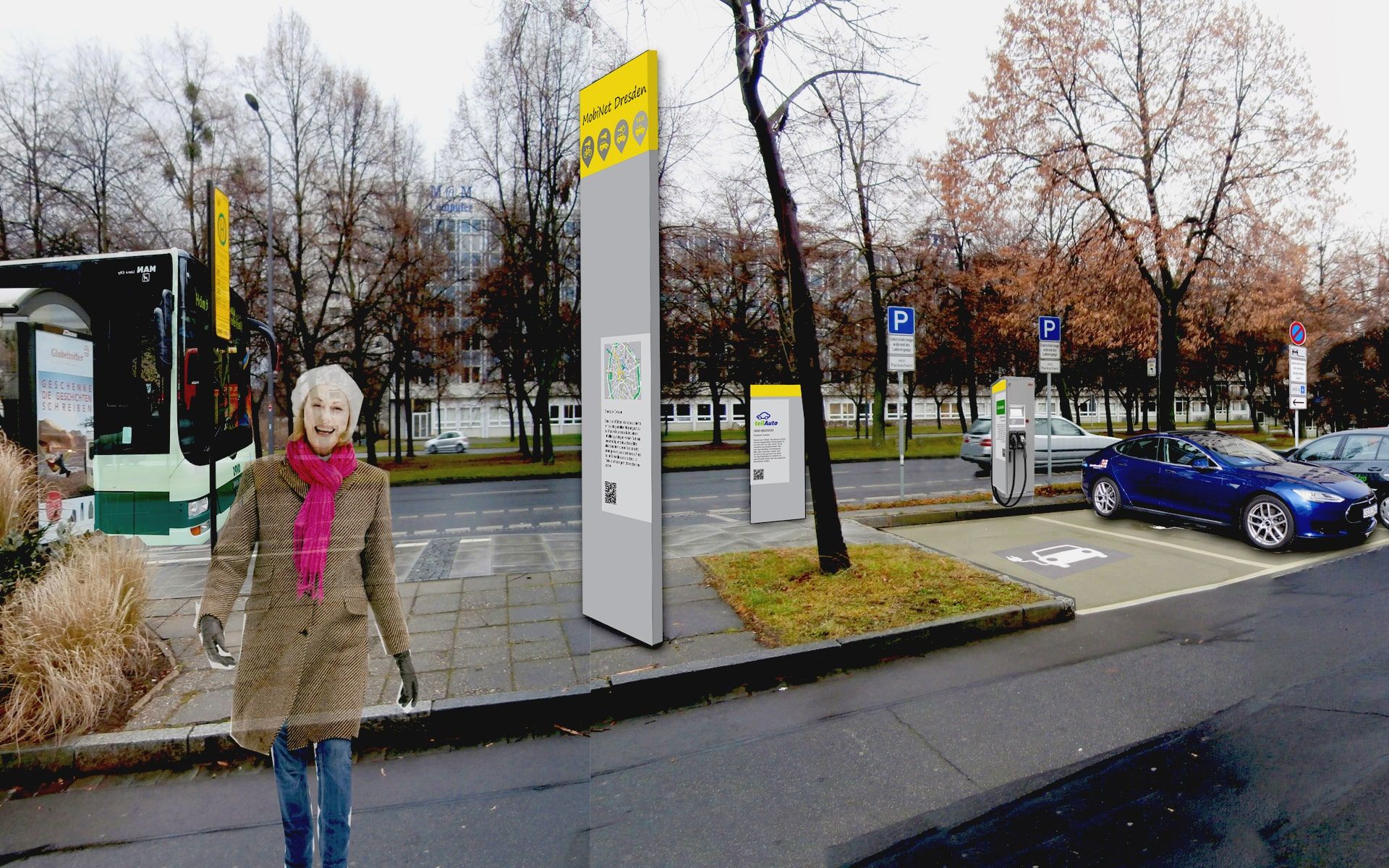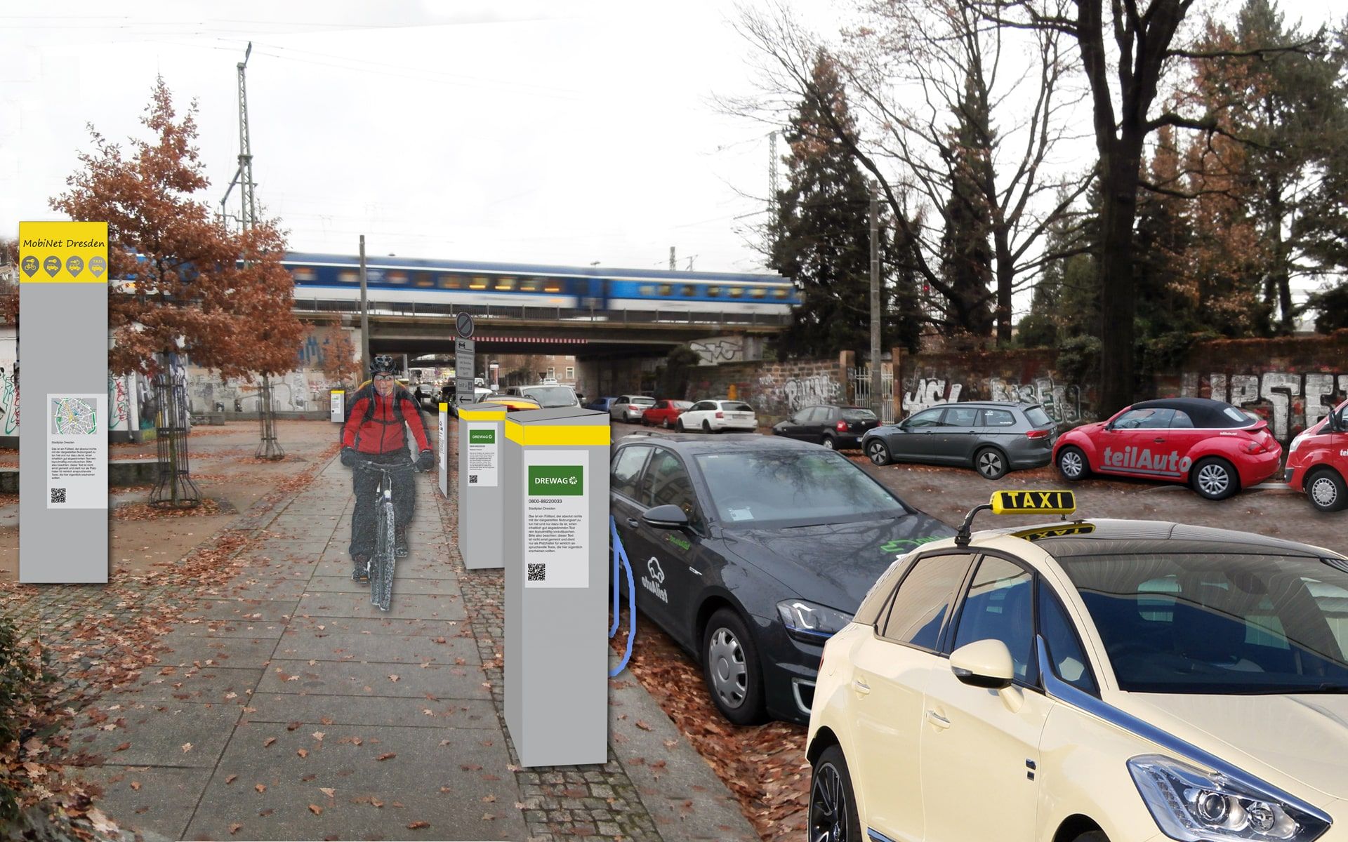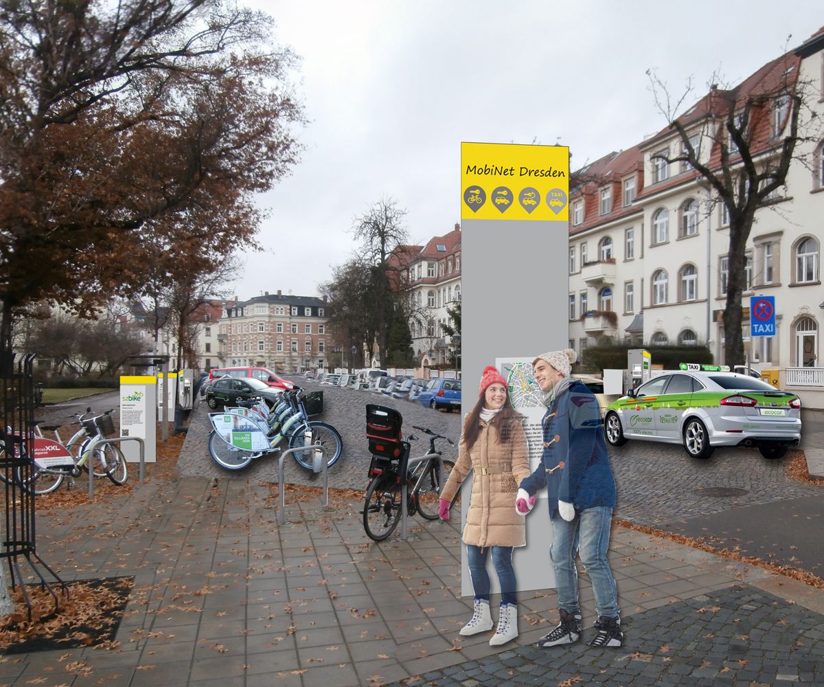 Aufgrund unserer besonderen Kenntnisse im Bereich Öffentliche Mobilität wurden wir für eine Gestaltungsstudie für die neuen Mobilitätspunkte in Dresden beauftragt. Diese Punkte sollen Angebote des Öffentlichen Nahverkehrs direkt mit privaten Angeboten wie Car- und Bikesharing sowie E-Laden verbinden. Neben der Farb- und Formgebung stand die Anzahl und Anordnung der Leitelemente im Vordergrund. Im Baukastenprinzip wurde das Grundkonzept der Mobilitätsstationen entwickelt und mit allen Fachämtern abgestimmt. Beispielhaft haben wir fünf verschiedenartige Standorte detaillierter geplant, visualisiert und die Kosten ermittelt. Zu unserer Freude basiert das nunmehr bereits umgesetzte Netz Dresdner Mobilitätspunkte auf unserer Studie und wird von den DVB betrieben