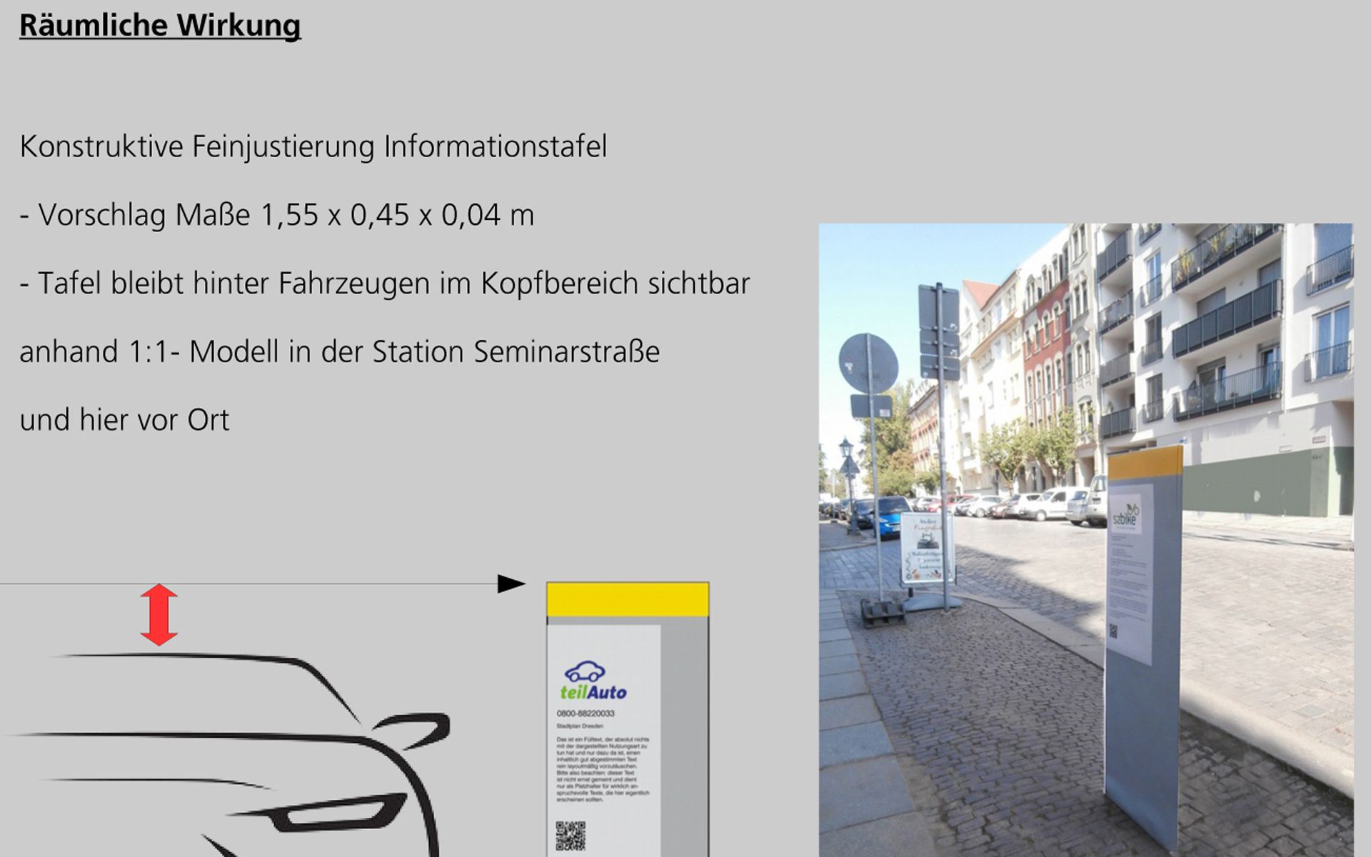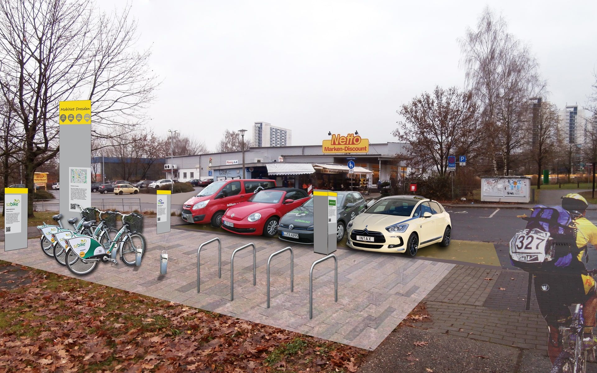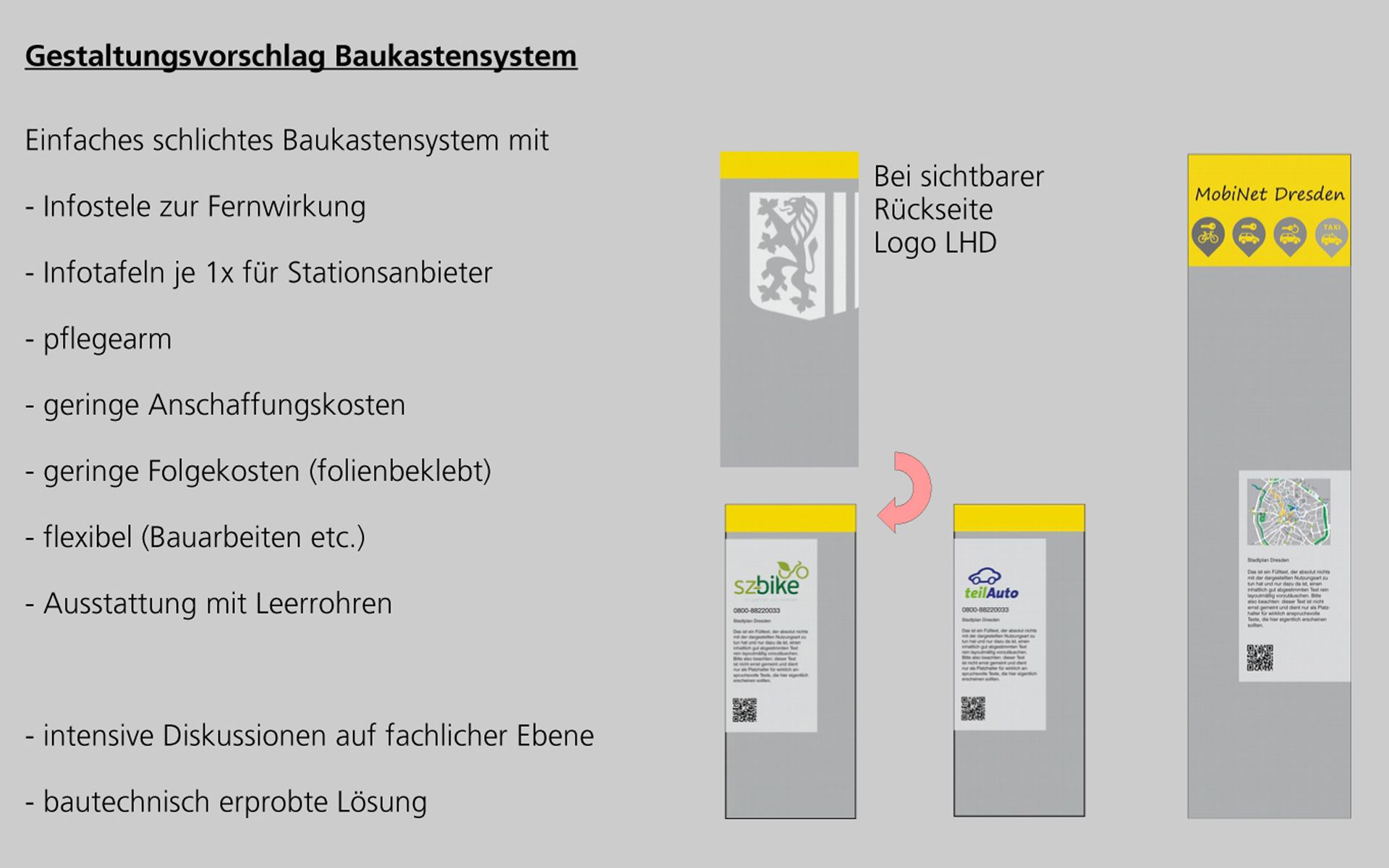 Aufgrund unserer besonderen Kenntnisse im Bereich Öffentliche Mobilität wurden wir für eine Gestaltungsstudie für die neuen Mobilitätspunkte in Dresden beauftragt. Diese Punkte sollen Angebote des Öffentlichen Nahverkehrs direkt mit privaten Angeboten wie Car- und Bikesharing sowie E-Laden verbinden. Neben der Farb- und Formgebung stand die Anzahl und Anordnung der Leitelemente im Vordergrund. Im Baukastenprinzip wurde das Grundkonzept der Mobilitätsstationen entwickelt und mit allen Fachämtern abgestimmt. Beispielhaft haben wir fünf verschiedenartige Standorte detaillierter geplant, visualisiert und die Kosten ermittelt. Zu unserer Freude basiert das nunmehr bereits umgesetzte Netz Dresdner Mobilitätspunkte auf unserer Studie und wird von den DVB betrieben